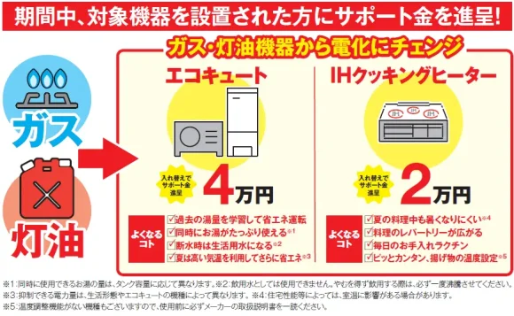 ガス・灯油機器から、エコキュートなどの電化機器に入れ替えるお客さま向けのキャンペーンを実施中です。
