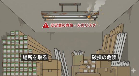 - 保管破損リスク: 蛍光灯は衝撃に弱く、水銀を含むため破損時の処分も困難です。