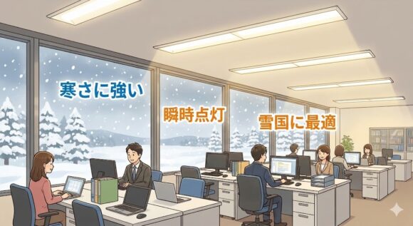 蛍光灯は気温が低いと明るくなるまで時間がかかります。一方、LEDはマイナス20度でも瞬時に100%の明るさで点灯します。冬の岩手での作業効率が劇的に変わります。